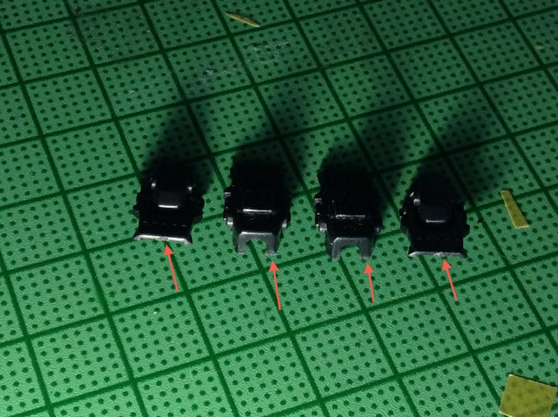 左から、コトブキヤ一回切り、同二度切り、タミヤ二度切り、同一回切り。ランナーからの切り出しはゲートを少し残して、余剰部分をもう一度切る、というのが定説ですが、最近のわたしは横着してそのまま切り出してしまってます。なんだかんだで、合わせ目消しとかパーティングライン処理とかで、結局はヤスリをかけるので、ゲート処理は適当でも良い。パチ組みの場合はパチ組みなので気にしてもしょうがないというわけです。