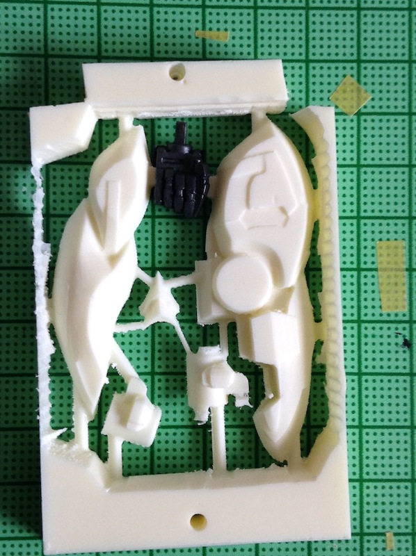 張り合わせ用に軸打ちのガイドを彫ってあります。アンタレスは設定画を参考にラフを描いて、それを3DCGにして、切削データにして、という手順で作ってますが、悩みどころはサイズでした。グリップをACVIの汎用ハンドパーツに合わせる必要があるのですが、最初作ったデータでは、どう考えてもでかすぎる。干渉部分をいじって持てるようにはしましたが、それでもimodela用の枠にギリギリ収まる位。厚みも相当なもので、一番厚いところで20mm近くはあると思います。当然、重い。接着面で分割して、中を中空にして軽量化というのも考えないでもなかったのですが、パーツ数増やすのもちょっと……ということを考えてます。