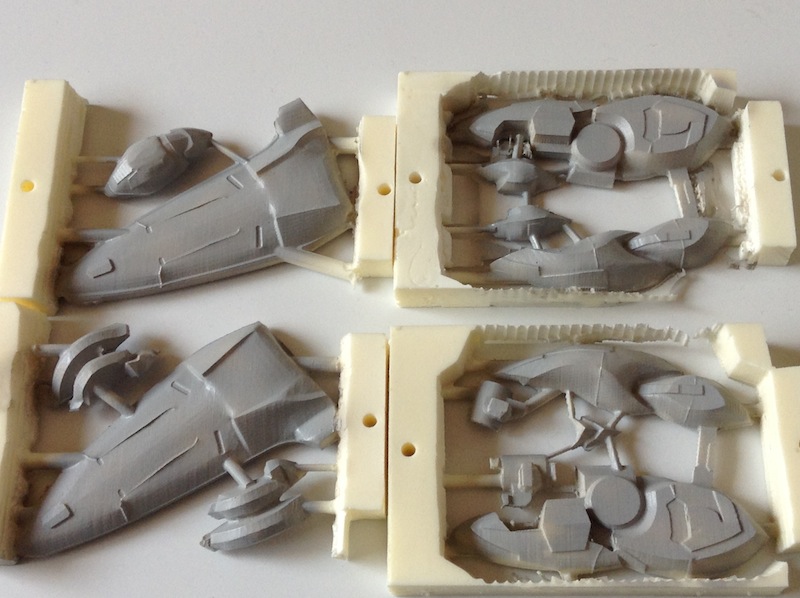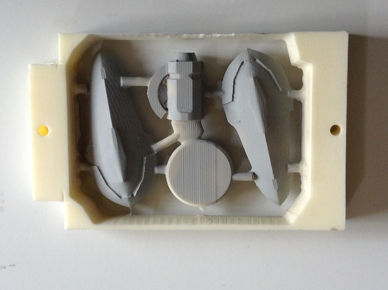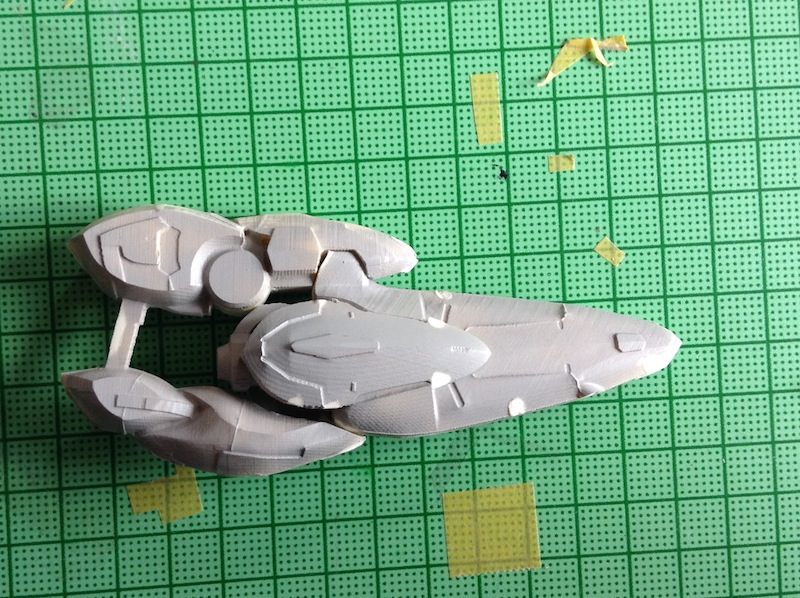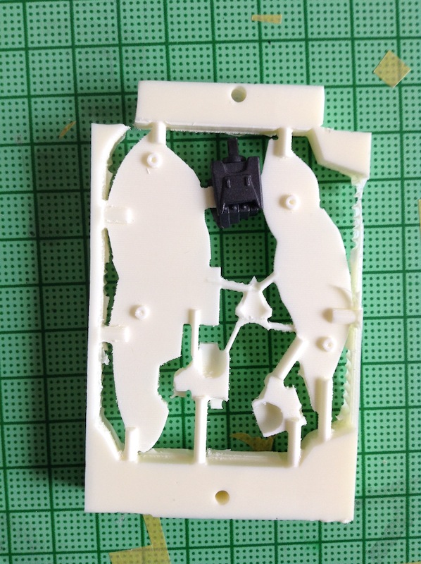 案の定、分割の切断面の接着には難儀することに。データ上、ぴったりくっつくはずなんですが、「はず」なんて言っているようなことが上手くいくわけなんてありません。というわけで金属板の上で押し当てながら、光硬化パテで調整しつつ接着。パテの厚さが試行錯誤を物語ってくれてます。