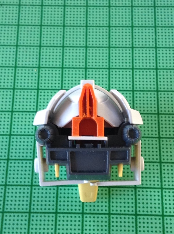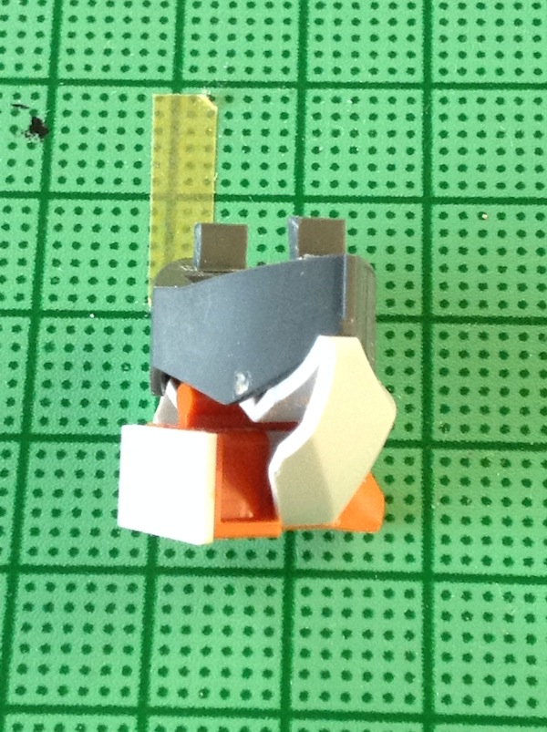 作業は、オレンジのあごのパーツがポリ受けになっているので、ここを前後で詰めて、ポリパーツのがたつきを防ぐためにプラ板で蓋をします。それから干渉するグレーのパーツを適当に切り欠けば完了です。