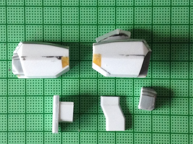 なぜかサイドブースターのノズル作るのにやたら時間がかかってしまいましたが、どうにか肩〜上腕は概ね形になりました。肩武器のジョイント周りは七ミリパイプが必要になるので、後回し。関節周りも後回しにしているので、パーツが繋がらないのですが後々どうとでもなりましょう。ちなみにこうやって関節周りを後回しにした結果、終盤で大変なことになったのが前回の武器腕ショットガンです。