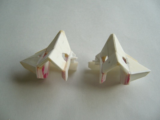 バックパックではこんな形。機首の畳み方に無理やりなところが在りますが、それ以上にエアストレーキが小羽っぽくて違和感大です。極力、尖っていたり羽っぽかったりするパーツは露出しないようにしたかったのですが、こればかりはしょうがない。