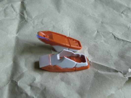 拘りどころのカトキスリッパ。あまり拘ると収拾がつかなくなるので程々に済ませます。つま先の裏を先端に向かって削り(青線のところ。C面を対角線で削りました)反り返るようにして、さらに上面にプラ板を貼って削って形を整えます。足の甲はソールのC面に合わせてラインを繋げるように削り込みました。