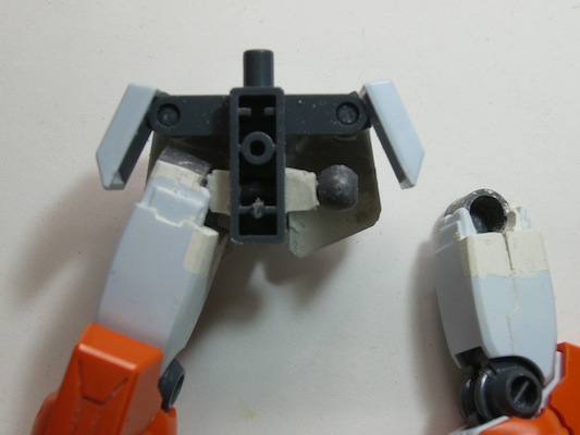 股関節はコトブキヤの球体ポリとポリ受けに交換。これで、股関節の切り抜きが埋められます。関節位置変更で大腿も延長してます。