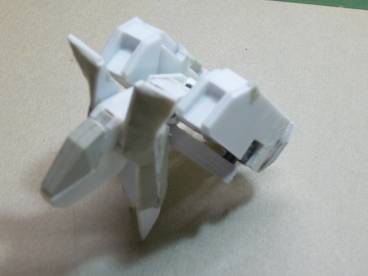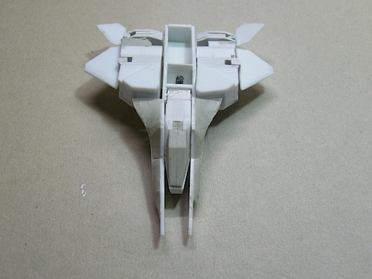 上から見ると今風の架空戦闘機のラインになるかと思います。機首の隙間は、コクピットブロックを仕上げてからの接着になります。バックパック時に浮いていた小羽はラインを繋げるためにエアストレーキを大型化したかったからでして、お陰でこの状態ではそれなりにまとまって見えるのではないでしょうか。