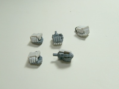 全体的に丸指になるように削り込んで、足りない部分はプラ板で厚くしました。形状を変えた分だけ、内側も削り込み。設定とは違う形状ですが、パーツ数を考えると、これ位にしておくのが手軽かと思います。