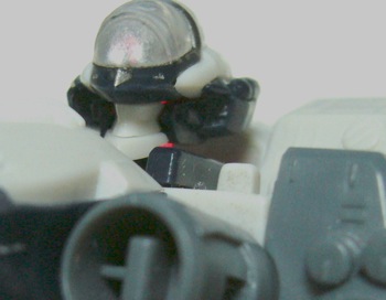 厚い厚いと前々から思っていた頭部のクリアパーツを削り込んで薄くしました。さらに内部メカを金属色で、クリアパーツ内側をホワイトパールで塗装。戦闘機のキャノピーの裏側のパールで塗装するといい感じにそれっぽくなる(?)という話を小耳に挟んだので実行してみました。少しパール粉の濃度が濃すぎた感もあるのですが、ゲーム中のグラフィックのような半透明がうまい具合に出たかと思います。