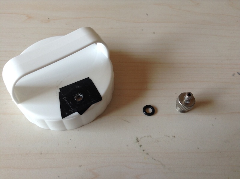 蓋に4.8mmの穴を空けて、クレオスの口金変換アダプタのSタイプの方をねじ込みます。内径5mmのオーリングを挟み、蓋の方にもビニルテープを貼っておいて、エア漏れを防ぎます。