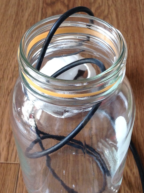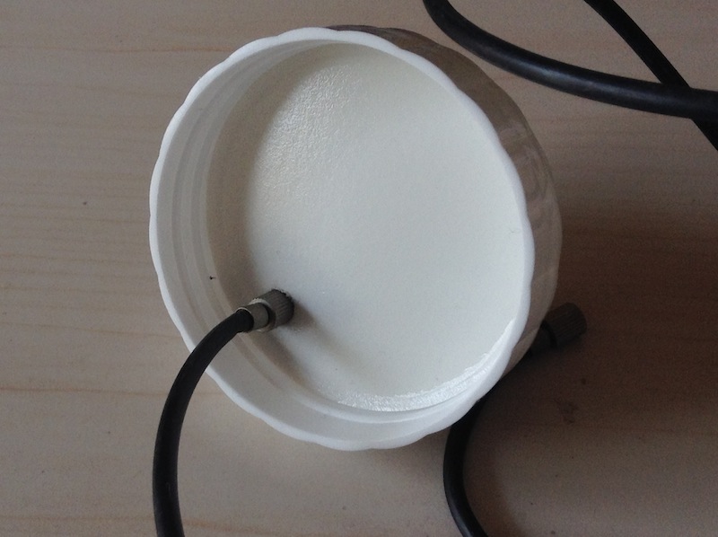 そのまま蓋を付けてもエア漏れがしたので、瓶の口に輪ゴムを巻きました。テープを貼って目止めとかしてみましたが、この方法が一番密閉度が高かったです。とはいえ、多少漏れますし、ちゃんとしたタンクではないので、あまり圧力がかかるのもおっかないので、このままにしておきます。