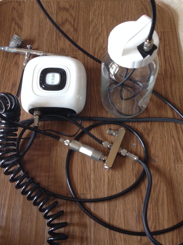 そういうわけで(大層な時間をかけて選出して)購入したのがエアテックスのAPC019-S、SPiCAのエアブラシセット商品です。本体のみだと実売¥10000、セットで¥15000位ですが、セットだと0.3mmと0.2mmのエアブラシが一本ずつ付属します。コンプレッサーが重複しても、エアブラシが一本¥5000くらいと相当安く見積もって考えても、コンプレッサー本体価格は¥5000相当。このくらいなら、まあ……。