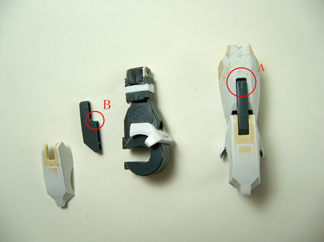 ついでに膝フレームの位置も変更します。画稿ではAの部分に若干の隙間があります。というわけで延長分3ミリに対して、Bの部分で2ミリ分干渉部を削って上にずらすようにします。