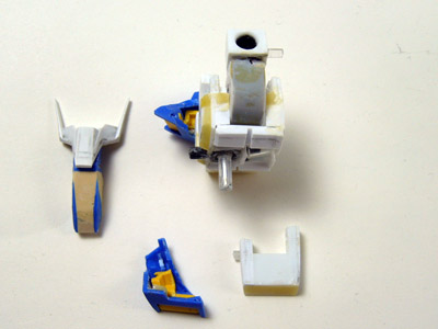 本来ならこのパーツ、もう少し前後幅が薄い形状です。とはいえ、胴体側のボールジョイントの幅や、キットの肩のパーツに合わせた結果、この幅にせざるをえないということになります。この部分の再現度はキットの方が高いくらいですが、修正するには、一度接着した肩をばらして幅をつめるところから始めないといけないのであきらめることにします。