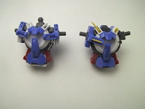 ちなみに、胴体の分割を太陽炉のコーン部分の裏でやってやると、肩から生えるケーブルの後嵌めができます。写真ではかなり大雑把にやっているので、後ろから見ると若干分割ラインが見えてしまうのですが、段差の所で切断すれば大分目立たなくなるはずです。