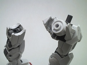 続いて椀部。肘関節をコトブキヤの二重間接にします。これは可動範囲よりもデザイン画の再現のため。実際、可動範囲は大して変わりません。表面にはモールドや切り欠きを入れておきます。手首はサーベル用なので軸の根元の角度変更。GNソードは差し替えで収納状態を再現出来るようにします。各部を海老川氏の設定イラストを参考に、角度を変更して接着し直します。接続はコトブキヤのABSパーツの余り。二重間接用の中継パーツを加工して接着してあります。ソード使用時のものは後で別途用意します。