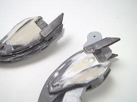 この写真で分かるかどうか、というところですが、手前側のスネのフィン。エポパテを固めるときの電灯の熱で曲がってしまったのでした。
