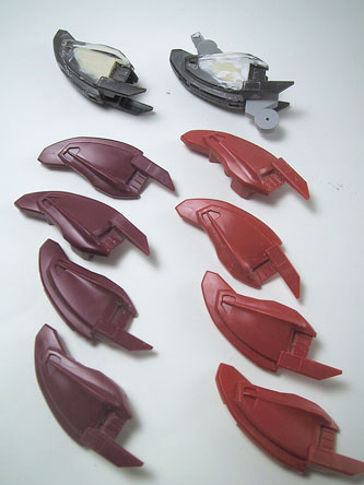 まずは一番の難所の、スネの形状をそろえるところから始めます。そのためにスネのノズルのモールドを削り取ります。それにしても、エポパテでスネの曲面の形を整えるのがあと八個。少ししんどいからもしれません。