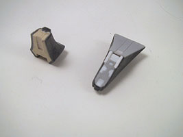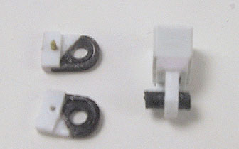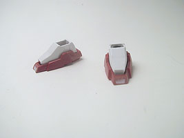 前腕の軸受けを切り離して、前後対照のかまぼこ型にします。上腕には2ミリプラ板を貼りつけます。関節軸は3ミリポリ軸を使います。