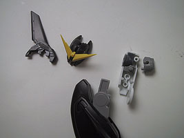 額のひさしは、分割を変更して合わせ目を消します。黄色いアンテナのピンの上部は邪魔なので切除します。フェイスもピンを落とせば後嵌めが出来る……と思ったのですが、よく考えたら分割線が表に出ない設計なのでした。こういうところはバンダイは優秀なのですが。