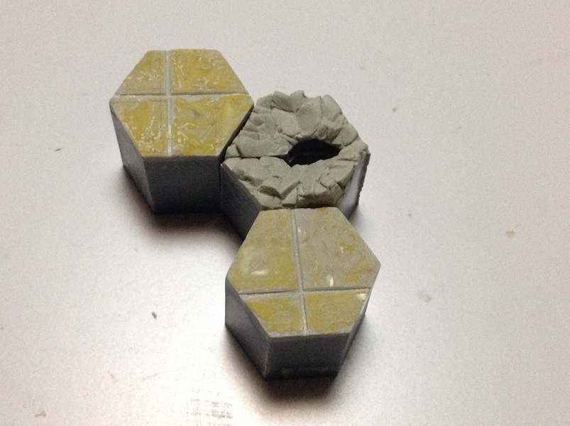 とはいえ、先々週の辺りで真ん中の砕けた床の造形と、他二つの上面の面だしは済んでいたので、上面のテクスチャ処理の作業をやっただけですが。ここは、インテリア用のマスキングテープで済ませたり、柄のデカール用意したり、とか考えていたのですが、モールド手彫りと光硬化パテの併用で仕上げることにしました。攻略本を参考に作業をしてみましたが、サフを吹いてからでないと狙った効果が出せているか分からないのが業腹です。