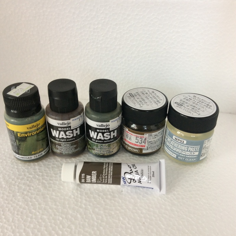 今回用意したのは、ファレホのウォッシング用塗料とMr.モデリングペースト二種。あとはホルベインDUOなる水溶性油絵の具を画材店で見かけたので一本買ってみました。それにしても総額で¥3000位……、ウェザリングってお金かかるんですね。