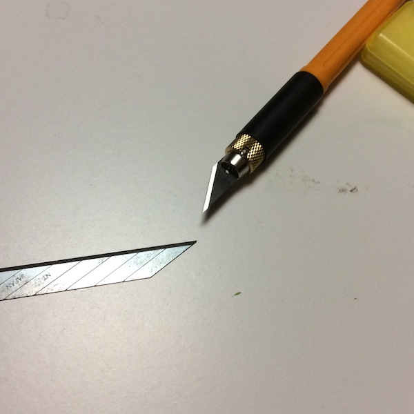 それはそれとして、私はアートナイフの刃をデザインナイフの刃を二枚重ねで使っています。