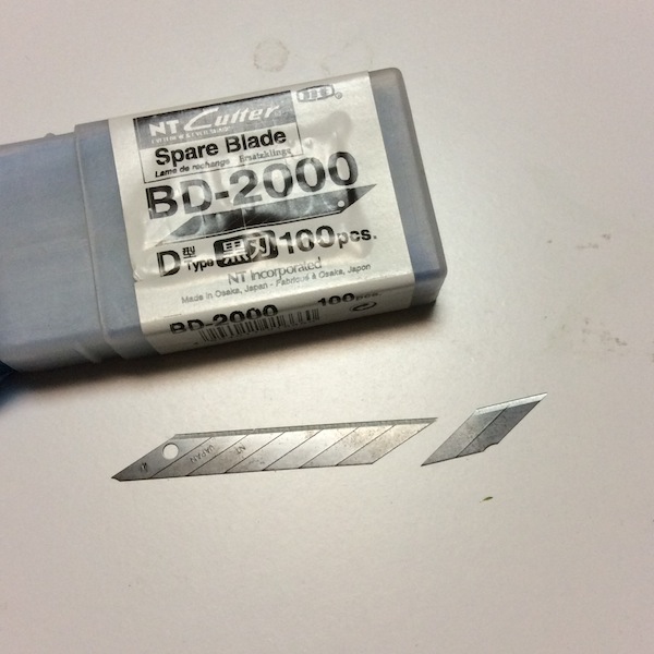 NTのBD-2000はオルファの特選黒刃相当の商品で、切れ味も通常よりも上ということになっていたと思います。もっとも、模型に使う上では、切れ味は普通のデザインナイフの刃でも十分なので、その辺りはあまり拘ってもしょうがないような気もします。むしろ、このBD-2000の売りはそのコストパフォーマンスにあります。大量に入っているので、五年やそこらでは使い切れる気がしない代物。スクラッチをするときはかなり頻繁に刃を使い捨てていきますが、それでもなかなか減りません。