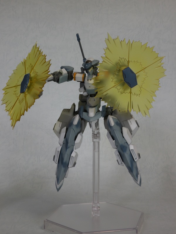 追加装備でエネルギーシールド×2とサムライソード2の短刀。前腕はアーキテクトを使用せず、独自構造になっており、シールドの展開や刀剣の両手持ちが見栄え良く決まるようになっています。手首に一軸を追加することで、手首の演技を意識したアクションが出来るようになっているというわけです。